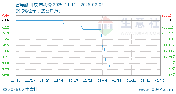 2月9日,生意社富马酸基准价为5700.00元/吨,与本月初持平。