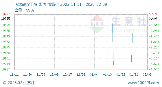 2月9日,生意社丙烯酸叔丁酯基准价为19500.00元/吨,与本月初持平。