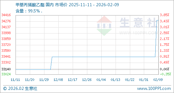 2月9日,生意社甲基丙烯酸乙酯基准价为34300.00元/吨,与本月初(33440.00元/吨)相比,上涨了2.57%。