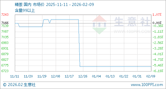 2月9日,生意社精萘基准价为6766.67元/吨,与本月初持平。