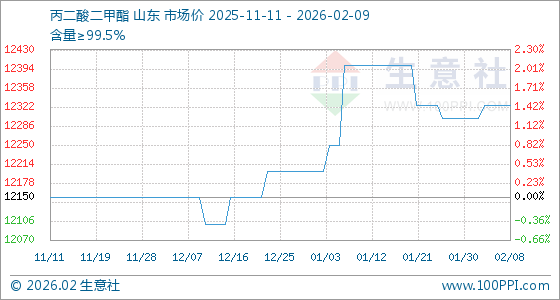 2月9日,生意社丙二酸二甲酯基准价为12325.00元/吨,与本月初(12300.00元/吨)相比,上涨了0.20%。
