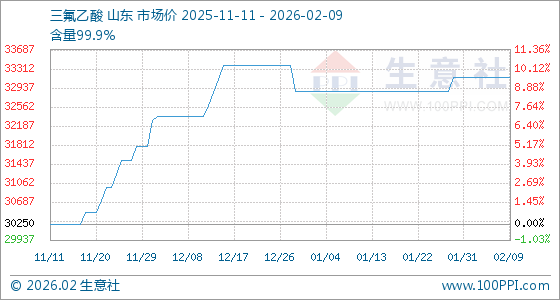 2月9日,生意社三氟乙酸基准价为33150.00元/吨,与本月初持平。
