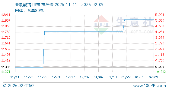 2月9日,生意社亚氯酸钠基准价为11950.00元/吨,与本月初持平。