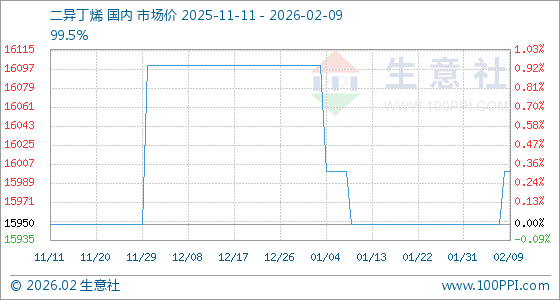 2月9日,生意社二异丁烯基准价为16000.00元/吨,与本月初(15950.00元/吨)相比,上涨了0.31%。