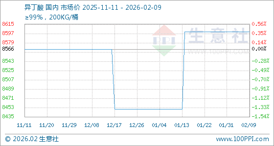 2月9日,生意社异丁酸基准价为8600.00元/吨,与本月初持平。