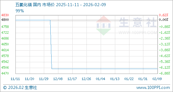 2月9日,生意社五氯化磷基准价为4500.00元/吨,与本月初持平。