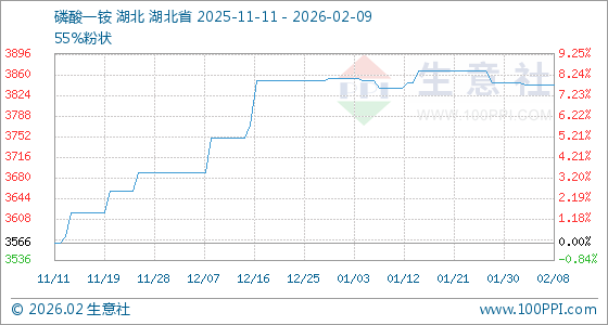 2月9日,生意社磷酸一铵基准价为3843.33元/吨,与本月初(3846.67元/吨)相比,下降了0.09%。