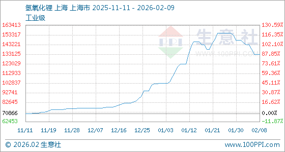 2月9日,生意社氢氧化锂(工业级)基准价为133000.00元/吨,与本月初(148000.00元/吨)相比,下降了10.14%。