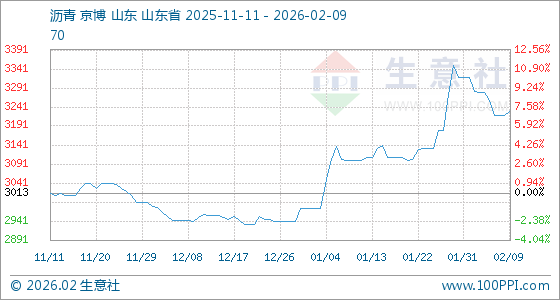 2月9日,生意社沥青基准价为3220.00元/吨,与本月初(3320.00元/吨)相比,下降了3.01%。