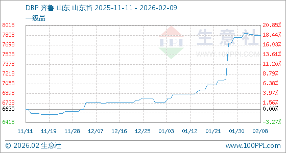2月9日,生意社DBP基准价为7851.67元/吨,与本月初(7818.33元/吨)相比,上涨了0.43%。