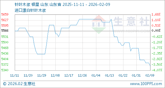 2月9日,生意社针叶木浆基准价为5383.33元/吨,与本月初(5466.67元/吨)相比,下降了1.52%。