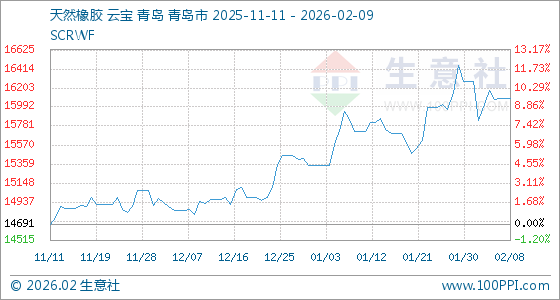 2月9日,生意社天然橡胶基准价为16083.33元/吨,与本月初(16275.00元/吨)相比,下降了1.18%。
