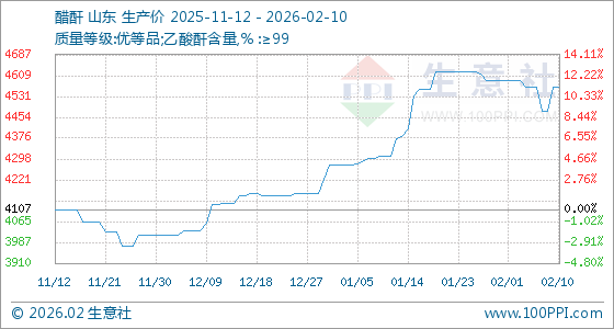 2月10日,生意社醋酐基准价为4565.00元/吨,与本月初(4590.00元/吨)相比,下降了0.54%。