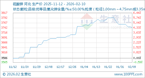 2月10日,生意社硫酸钾基准价为3743.33元/吨,与本月初(3760.00元/吨)相比,下降了0.44%。