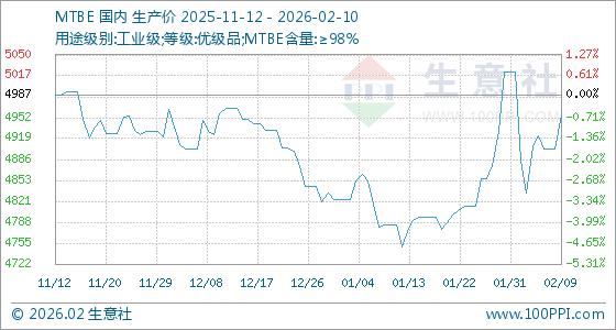2月10日,生意社MTBE基准价为4956.67元/吨,与本月初(5023.33元/吨)相比,下降了1.33%。