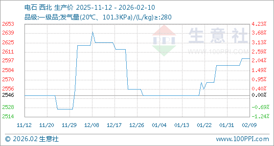 2月10日,生意社电石基准价为2602.00元/吨,与本月初(2592.00元/吨)相比,上涨了0.39%。