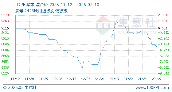 2月10日,生意社LDPE基准价为8750.00元/吨,与本月初(9066.67元/吨)相比,下降了3.49%。