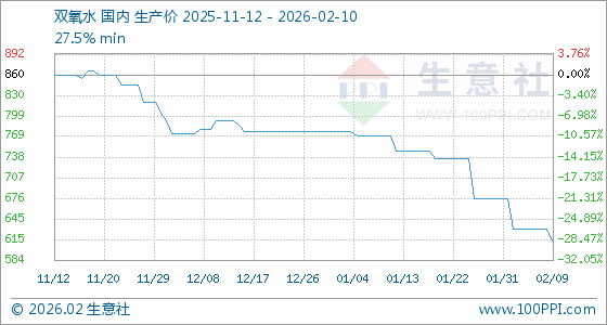 2月10日,生意社双氧水基准价为610.00元/吨,与本月初(676.67元/吨)相比,下降了9.85%。