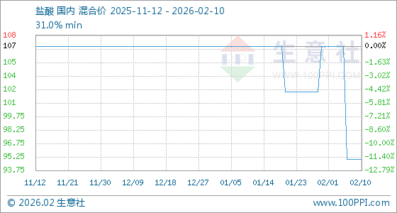 2月10日,生意社盐酸基准价为95.00元/吨,与本月初(107.50元/吨)相比,下降了11.63%。