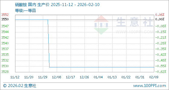 2月10日,生意社硝酸铵基准价为3530.00元/吨,与本月初持平。