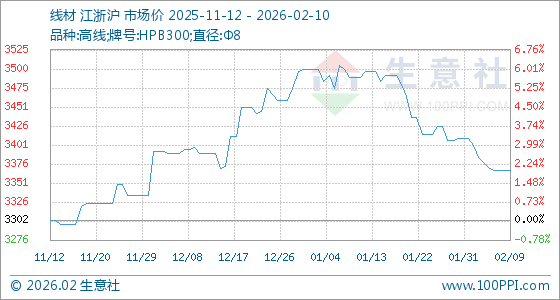 2月10日,生意社线材基准价为3367.50元/吨,与本月初(3410.00元/吨)相比,下降了1.25%。