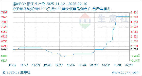 2月10日,生意社涤纶POY基准价为7150.00元/吨,与本月初持平。