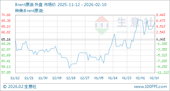 2月10日,生意社Brent原油基准价为68.05美元/桶,与本月初(69.59美元/桶)相比,下降了2.21%。