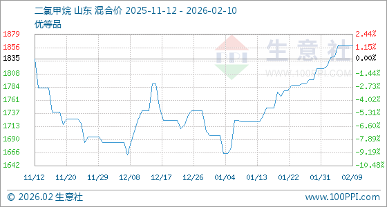 2月10日,生意社二氯甲烷基准价为1860.00元/吨,与本月初(1817.50元/吨)相比,上涨了2.34%。