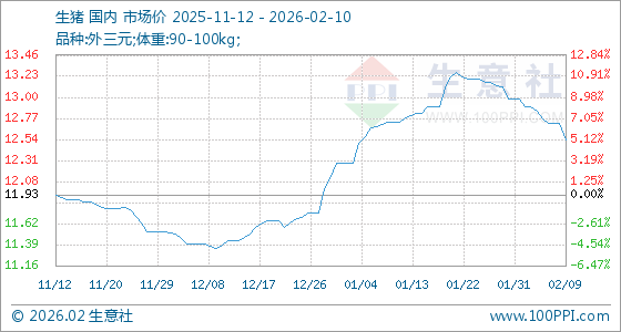 2月10日,生意社生猪基准价为12.53元/公斤,与本月初(12.98元/公斤)相比,下降了3.47%。