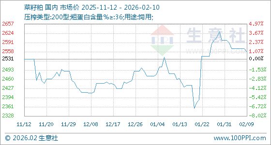 2月10日,生意社菜籽粕基准价为2558.00元/吨,与本月初(2600.00元/吨)相比,下降了1.62%。