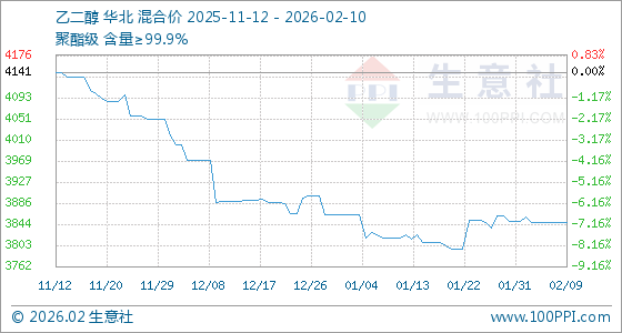 2月10日,生意社乙二醇基准价为3848.33元/吨,与本月初(3850.00元/吨)相比,下降了0.04%。