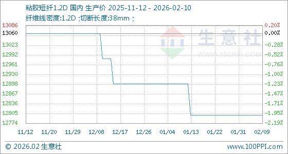 2月10日,生意社粘胶短纤1.2D基准价为12800.00元/吨,与本月初持平。