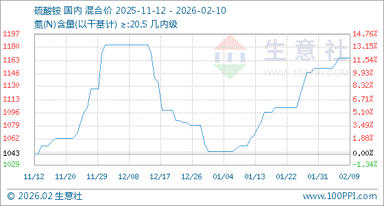 2月10日,生意社硫酸铵基准价为1166.67元/吨,与本月初(1153.33元/吨)相比,上涨了1.16%。