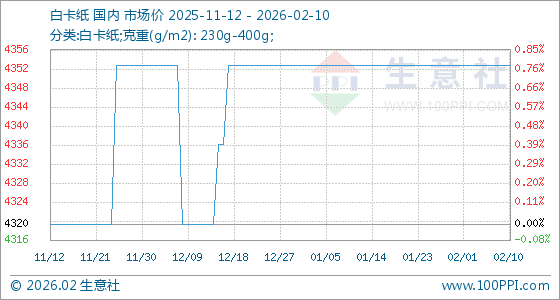 2月10日,生意社白卡纸基准价为4353.33元/吨,与本月初持平。