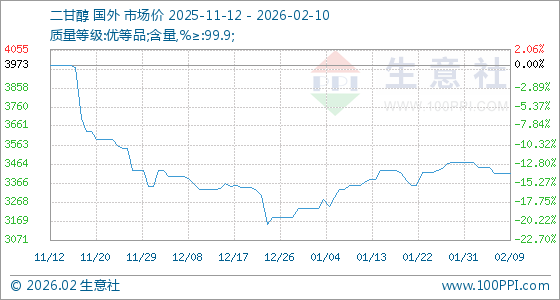 2月10日,生意社二甘醇基准价为3413.33元/吨,与本月初(3475.00元/吨)相比,下降了1.77%。