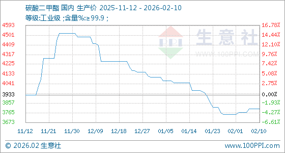 2月10日,生意社碳酸二甲酯基准价为3800.00元/吨,与本月初(3750.00元/吨)相比,上涨了1.33%。