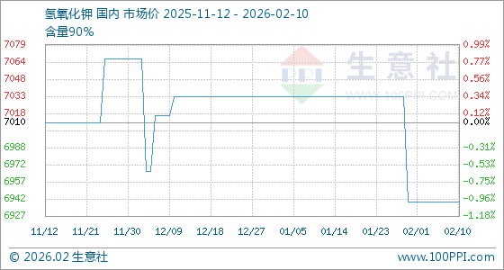 2月10日,生意社氢氧化钾基准价为6940.00元/吨,与本月初持平。