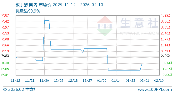 2月10日,生意社叔丁醇基准价为7025.00元/吨,与本月初持平。