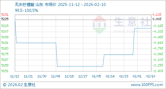 2月10日,生意社无水柠檬酸基准价为5212.50元/吨,与本月初持平。