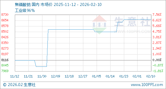 2月10日,生意社焦磷酸钠基准价为8666.67元/吨,与本月初持平。