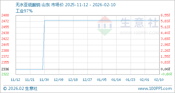 2月10日,生意社无水亚硫酸钠基准价为2475.00元/吨,与本月初持平。