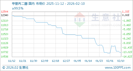 2月10日,生意社甲基丙二醇基准价为10725.00元/吨,与本月初(10700.00元/吨)相比,上涨了0.23%。