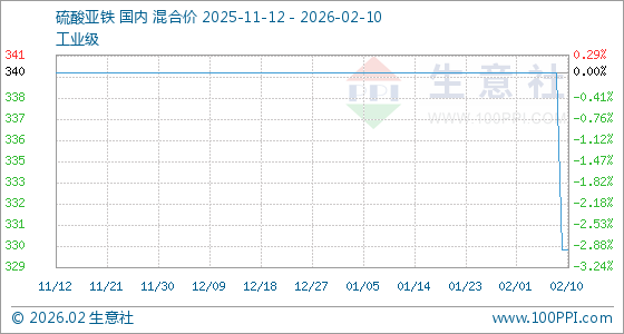 2月10日,生意社硫酸亚铁基准价为330.00元/吨,与本月初(340.00元/吨)相比,下降了2.94%。
