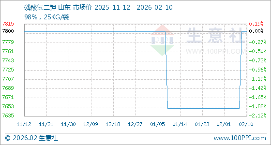 2月10日,生意社磷酸氢二钾基准价为7800.00元/吨,与本月初(7650.00元/吨)相比,上涨了1.96%。