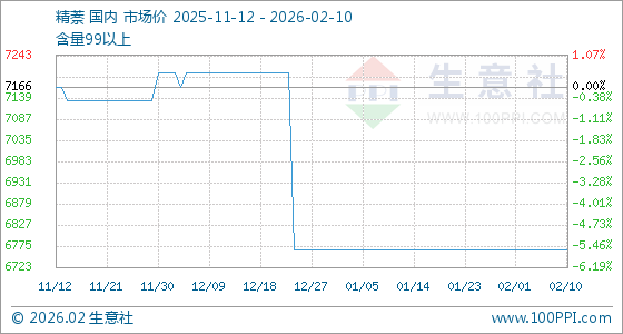 2月10日,生意社精萘基准价为6766.67元/吨,与本月初持平。
