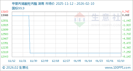 2月10日,生意社甲基丙烯酸羟丙酯基准价为12100.00元/吨,与本月初持平。