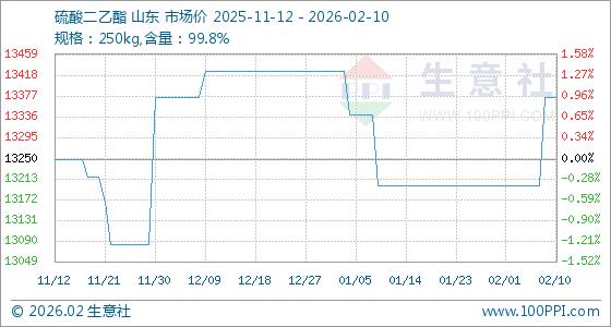 2月10日,生意社硫酸二乙酯基准价为13375.00元/吨,与本月初(13200.00元/吨)相比,上涨了1.33%。