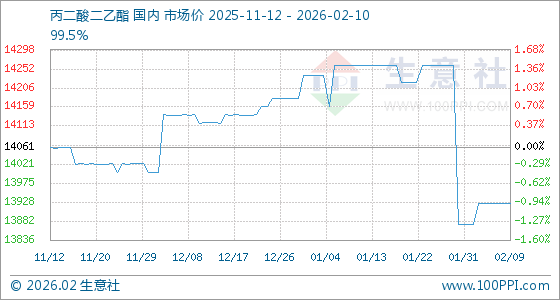 2月10日,生意社丙二酸二乙酯基准价为13925.00元/吨,与本月初(13875.00元/吨)相比,上涨了0.36%。