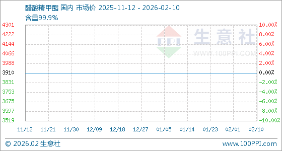 2月10日,生意社醋酸精甲酯基准价为3910.00元/吨,与本月初持平。