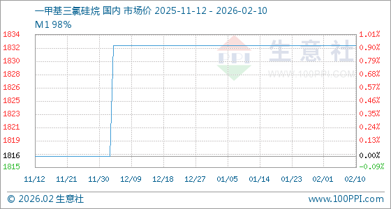 2月10日,生意社一甲基三氯硅烷基准价为1833.33元/吨,与本月初持平。
